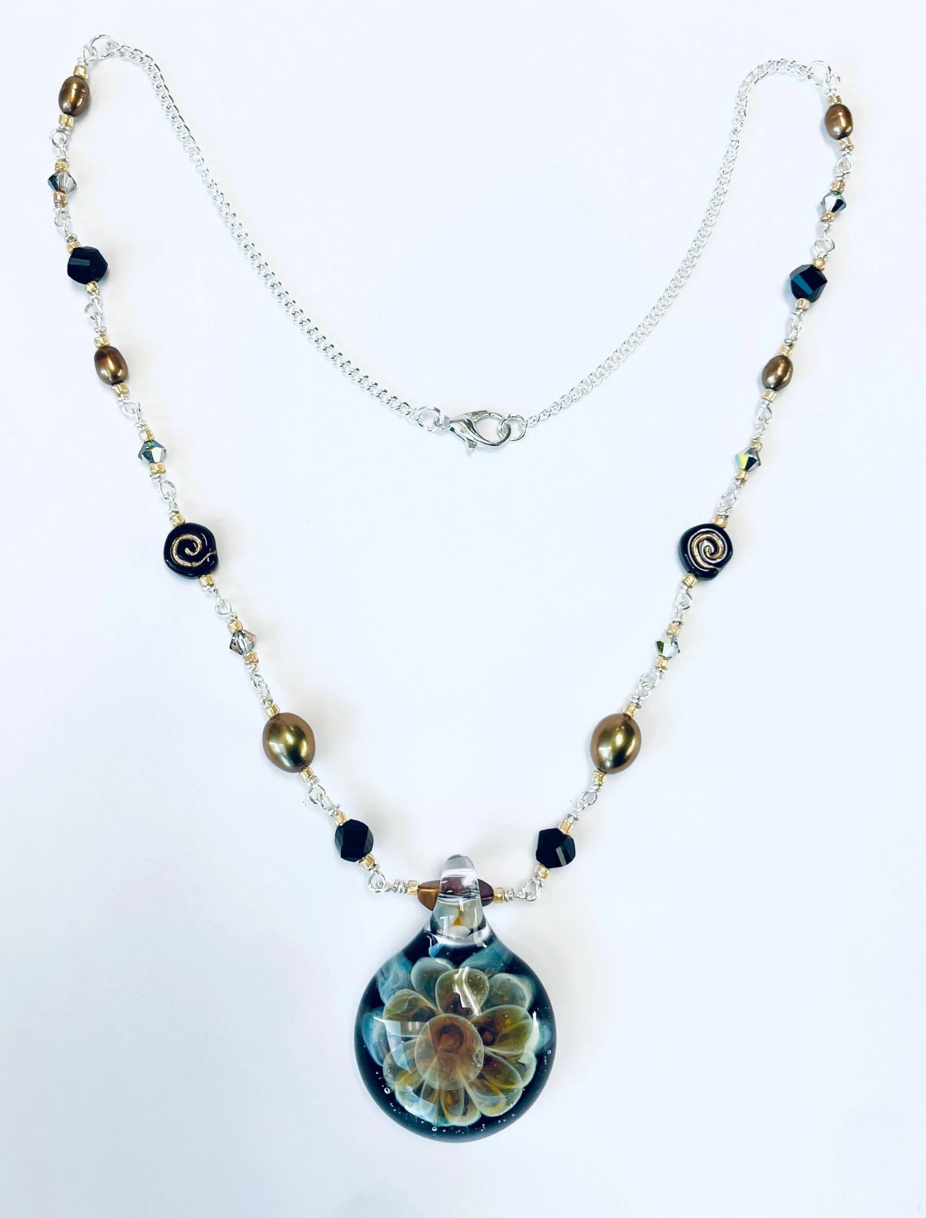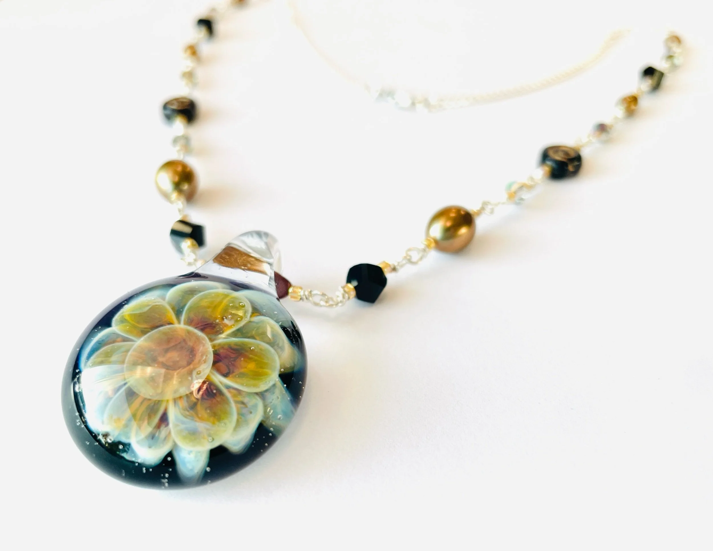 Image 1 of 2 Image 2 of 2 Glass Flower $69.99 Freshwater Pearl, Hematite, Swarovski Crystal, and Glass Flower. Quantity: Purchase Added! Freshwater Pearl, Hematite, Swarovski Crystal, and Glass Flower.